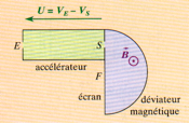 En S, ils quittent l’accélérateur avec une vitesse acquise, perpendiculaire à la plaque de sortie, et entrent dans le déviateur magnétique. Dans ce dernier, ils sont soumis à un champ magnétique uniforme perpendiculaire au plan de la figure. Ils sont enfin reçus sur un écran fluorescent F.