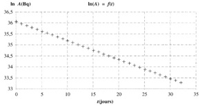 La courbe ln(A) = f(t) de l'échantillon de masse m0 est représentée ci-dessous.